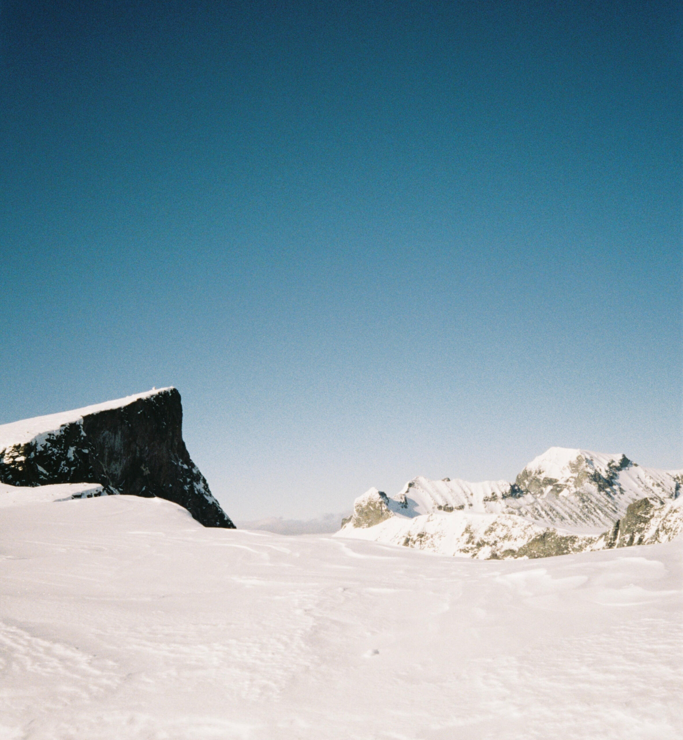 35mm picture of Skagsnebb from the ridge of Veslfjelltind. Here is a GPX file for a randonnee trip to Veslfjelltind, Skagsnebb and Hurrbreatind. The climb to Skagsnebb in winter requires slightly technical climbing.